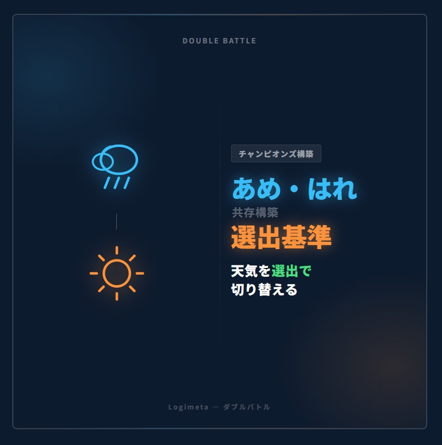 チャンピオンズ環境でメガシンカが解禁されたことで、天気構築の選択肢が一気に広がった。この記事では、筆者が実際に組んだ「天気の選択を選出で解決する」構築のロジックを公開する。あめとはれ、どちらの天気でも動けるように設計した6匹の役割と、選出を切り替える判断基準を解説する。